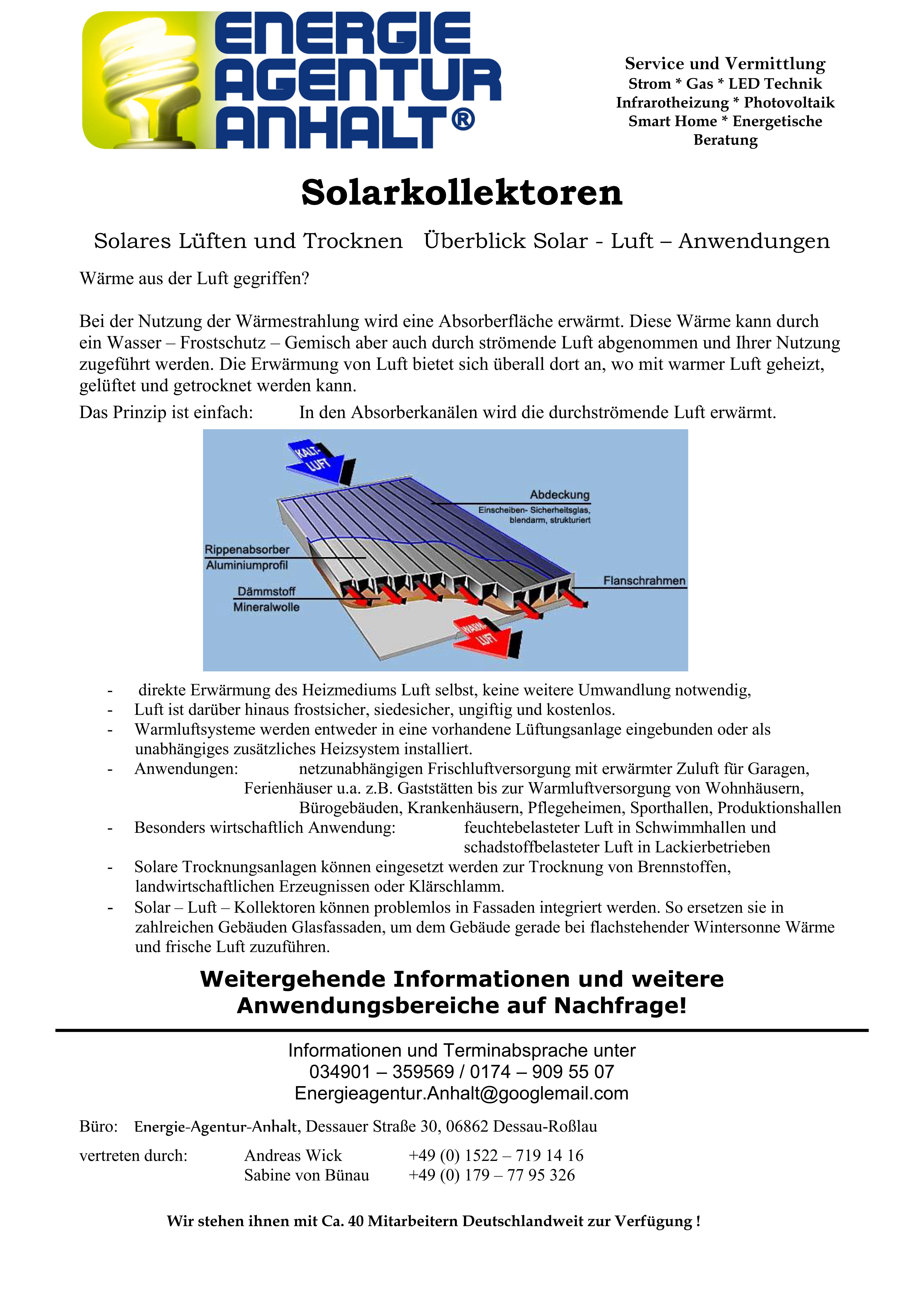 Bei der Nutzung der Wärmestrahlung wird eine Absorberfläche erwärmt. Diese Wärme kann durch ein Wasser – Frostschutz – Gemisch aber auch durch strömende Luft abgenommen und Ihrer Nutzung zugeführt werden. Die Erwärmung von Luft bietet sich überall dort an, wo mit warmer Luft geheizt, gelüftet und getrocknet werden kann.